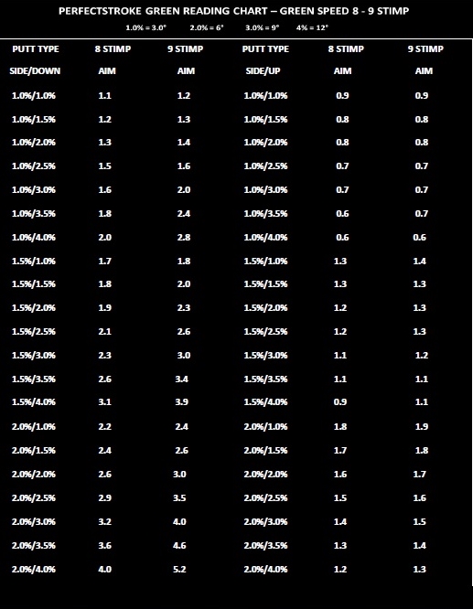 The reason that there is up to nine reference dots on the Perfectstroke Ball Markers is that with this system a player can accurately aim the ball and putter face even when they are faced with combination slopes including with downhill slopes. A player may be playing on fast green speeds and be faced with a 10 foot putt with a 2% right to left side slope and 2% down slope. In this case the player would need to aim around 10.5 – 11 degrees to the right of the target. The 2% side slope alone would mean that the player would need to aim around 7 degrees to the right and the 2% down slope would mean they would need to aim a further 4 degrees to the right. We provide charts that you can refer to when practicing that can provide a very accurate suggestion on where to aim or you can learn to do some basic math. With slight side slope and down slopes of up to 2% the calculations are quite easy to make and are extremely accurate –