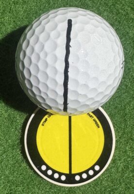 In the act of marking the ball and correctly aligning the ball marker it is important that the player is using a ball with a line on it to assist in accurate aim of both the marker and the ball for a breaking putt. There is a solid black line on the ball marker that needs to be aimed directly at the hole for every putt from any length regardless of the amount of break. The player can firstly aim the ball with a line on it directly at the hole then adjust the marker to the larger line on the ball. After the marker is aimed correctly, directly at the hole, the player can adjust the line on the ball to correspond with the estimated amount of slope for that putt.